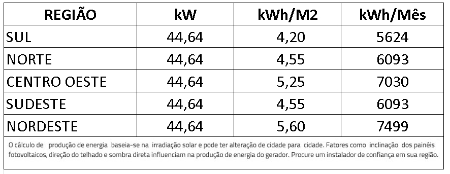 Atenção o gerador tem sua capacidade de geração de acordo com incidência de irradiação solar e a correta instalação, os dados de geração estão baseados no mapa* de radiação global horizontal média anual do Brasil.